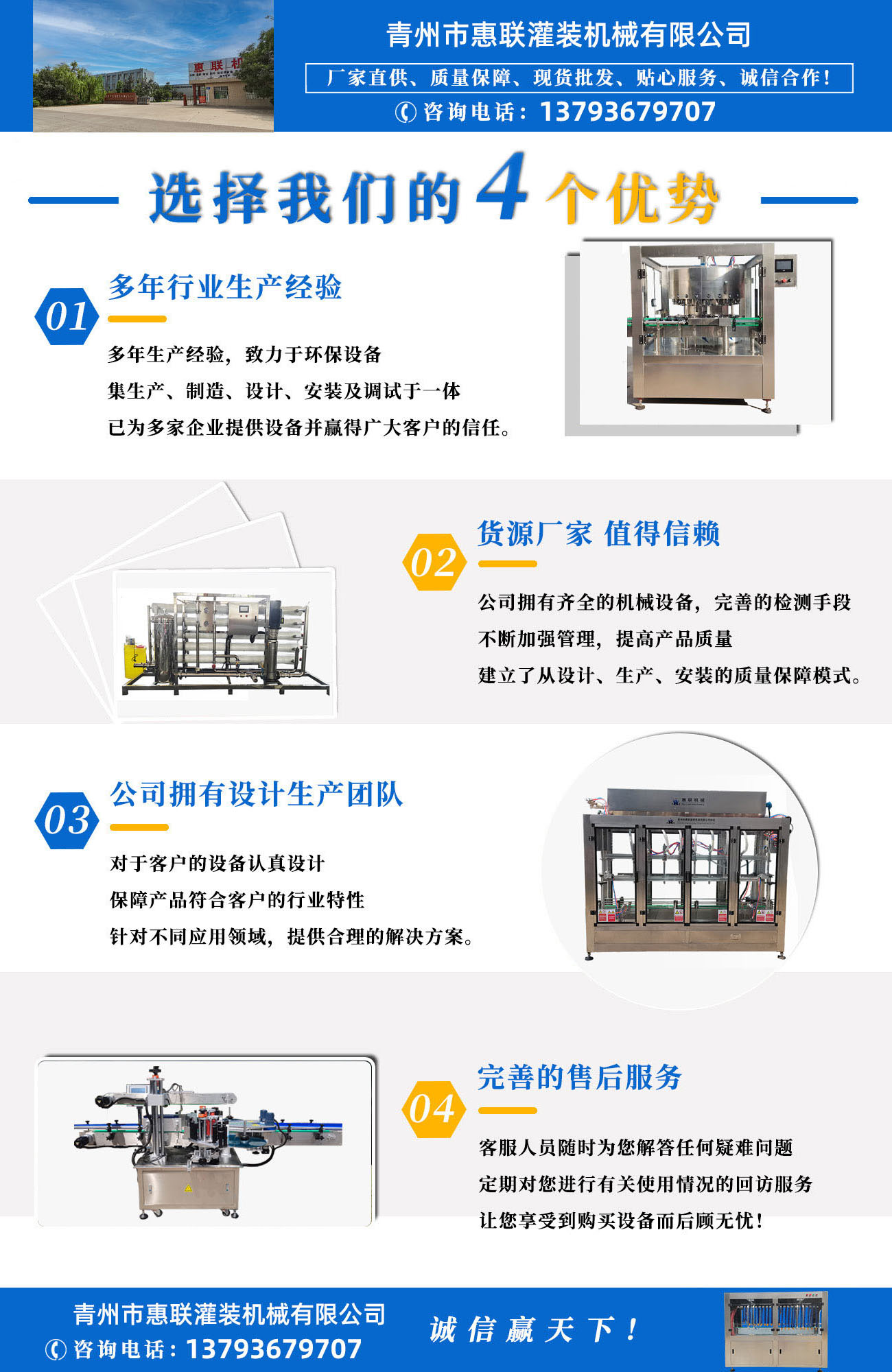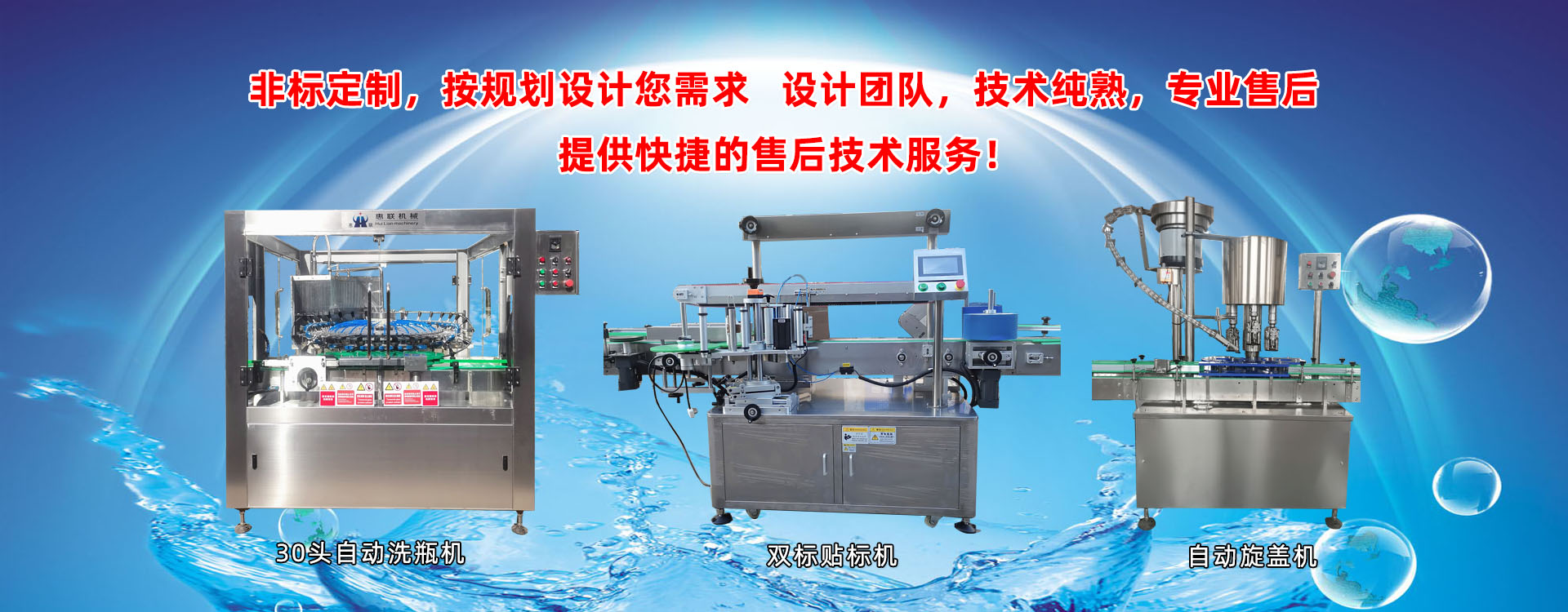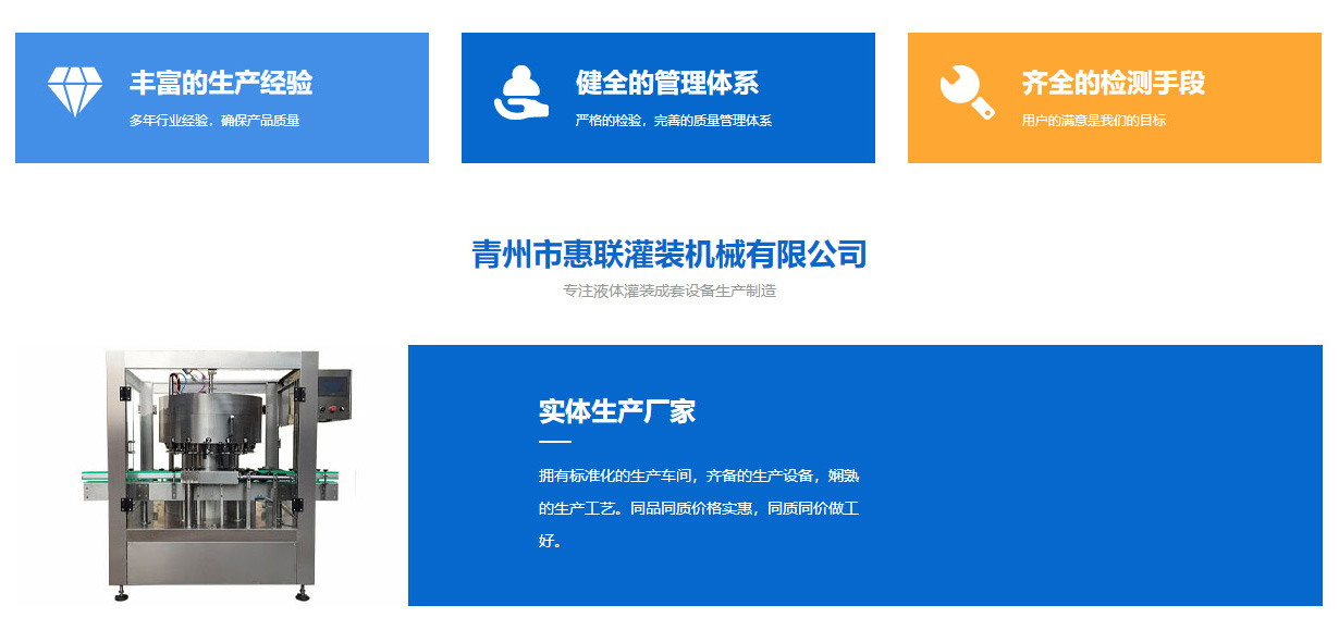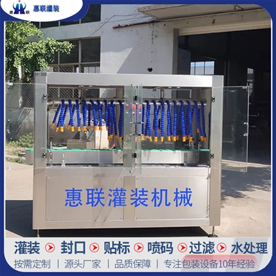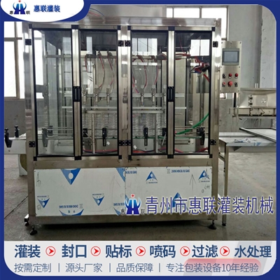 青州市惠聯(lián)灌裝機械有限公司是一家集生產(chǎn)研發(fā)、銷售、服務于一體的液體灌裝成套設(shè)備生產(chǎn)企業(yè),可根據(jù)廠家要求設(shè)計合理液體灌裝生產(chǎn)線,為用戶提供技術(shù)咨詢、設(shè)計工藝、場區(qū)平面布置、工藝改造、設(shè)備安裝調(diào)試等完善服務。 公司生產(chǎn)制造各種類型液體灌裝機、過濾機,水處理設(shè)備及液體灌裝成套設(shè)備。主要產(chǎn)品有:白酒、葡萄酒、黃酒等酒水灌裝機、食用油、機油、潤滑油等油類灌裝機、醬油醋、老抽、生抽等調(diào)味品灌裝機、防凍液、玻璃水灌裝機、酒精、84消毒液灌裝機、車用尿素灌裝機、口服液灌裝機、洗滌劑灌裝機等多種液體、膏體灌裝設(shè)備,全自動/半自動灌裝機型號多,規(guī)格全,洗瓶機、瓶子封口機、打塞機、熱縮機、瓶子烘干機、貼標機、噴碼機、輸送線、裝箱機、水處理設(shè)備等全套生產(chǎn)線相關(guān)配套設(shè)備齊全,自產(chǎn)自銷,一站式購齊,售后無憂。